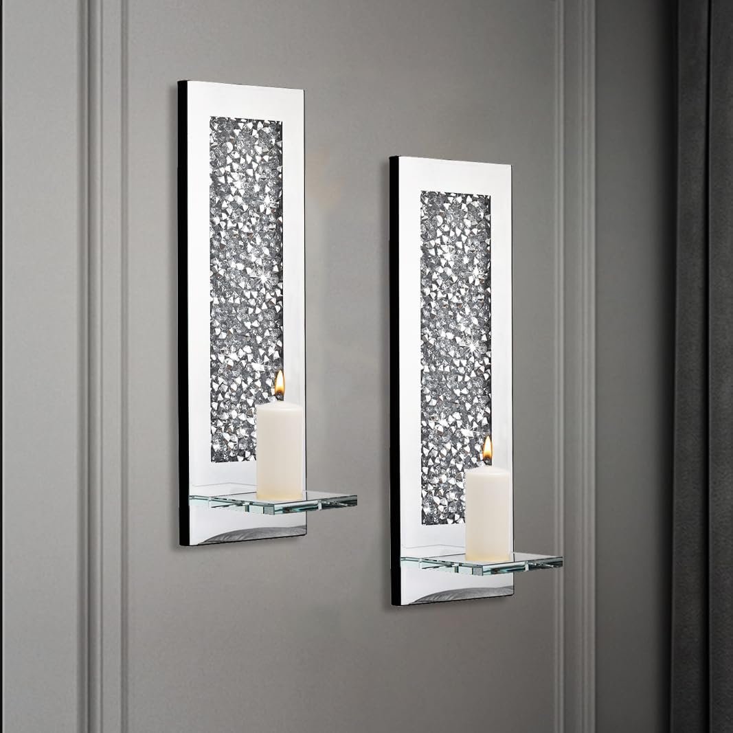 Crystal Crushed Diamond Wall Candle Holders set of 2, Silver Mirrored Candle Sconces,Home Decoration