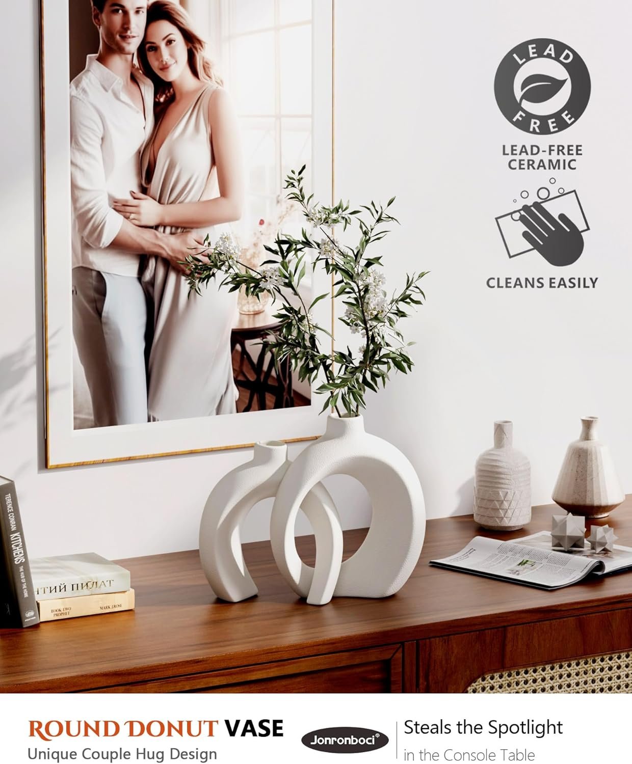 【Ideal Medium Size Donut Shape Decorative Vases for Any Space】This set of 2 decorative vases includes a large vase (H8.9 inch) and a small vase (H7.2 inch). The ceramic vases are the perfect size for use as centerpieces on your coffee table decor, dining table decor, or entryway table decor. With their unique donut shape, these modern vases create a stylish focal point in any room, whether placed individually or together, ideal for home decor for living room decor or bedroom decor.