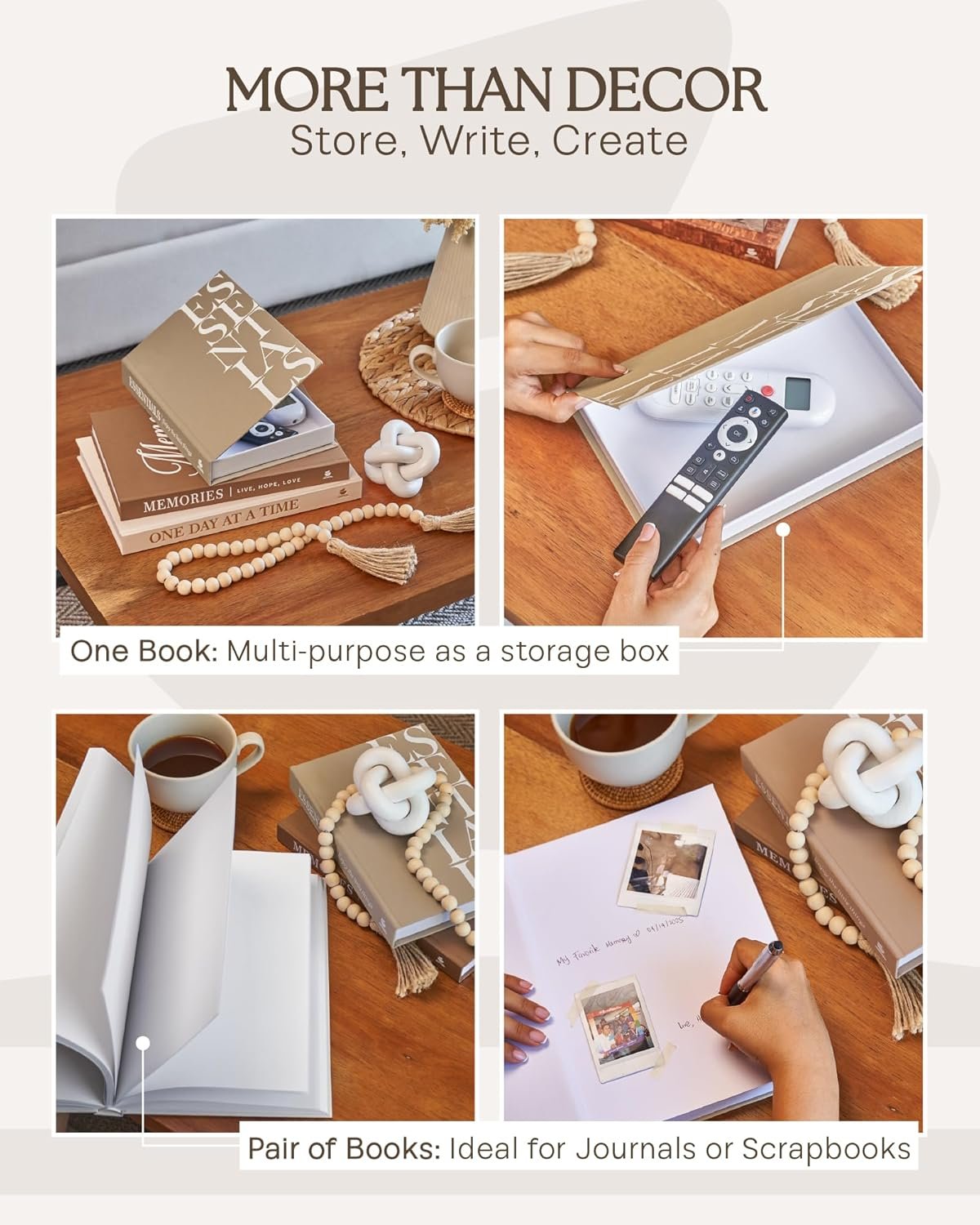 A STORY TO LIVE BY, FIND INSPIRATION IN EVERY DETAIL: Go beyond simple book decor with a set that inspires. Our decor books feature the powerful phrases “ONE DAY AT A TIME”, “MEMORIES: LIVE, HOPE, LOVE”, and “ESSENTIALS, ENJOY THE LITTLE THINGS”. Use the blank pages inside the large and medium books as a personal journal or photo album for your memories, making this a truly meaningful decorative object