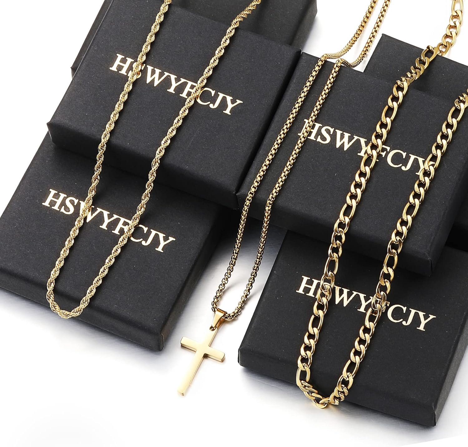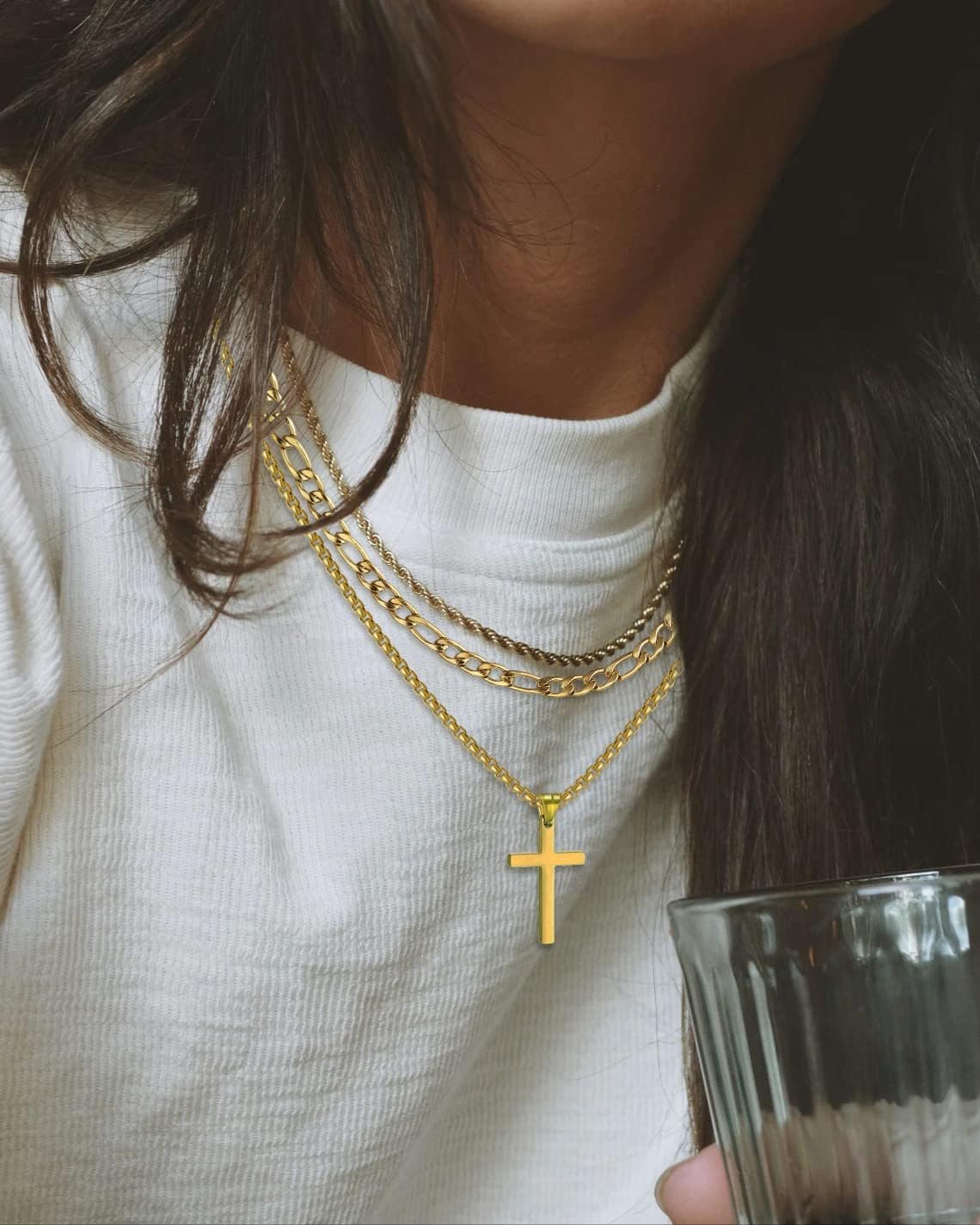 One order include 3 layered necklace, 1 cross necklace, 1 rope chain, 1 figaro chainThey can be weared alone or layer them togetherEach chain perfect match the cross pendant, so you can change different chain for the cross pendant charm