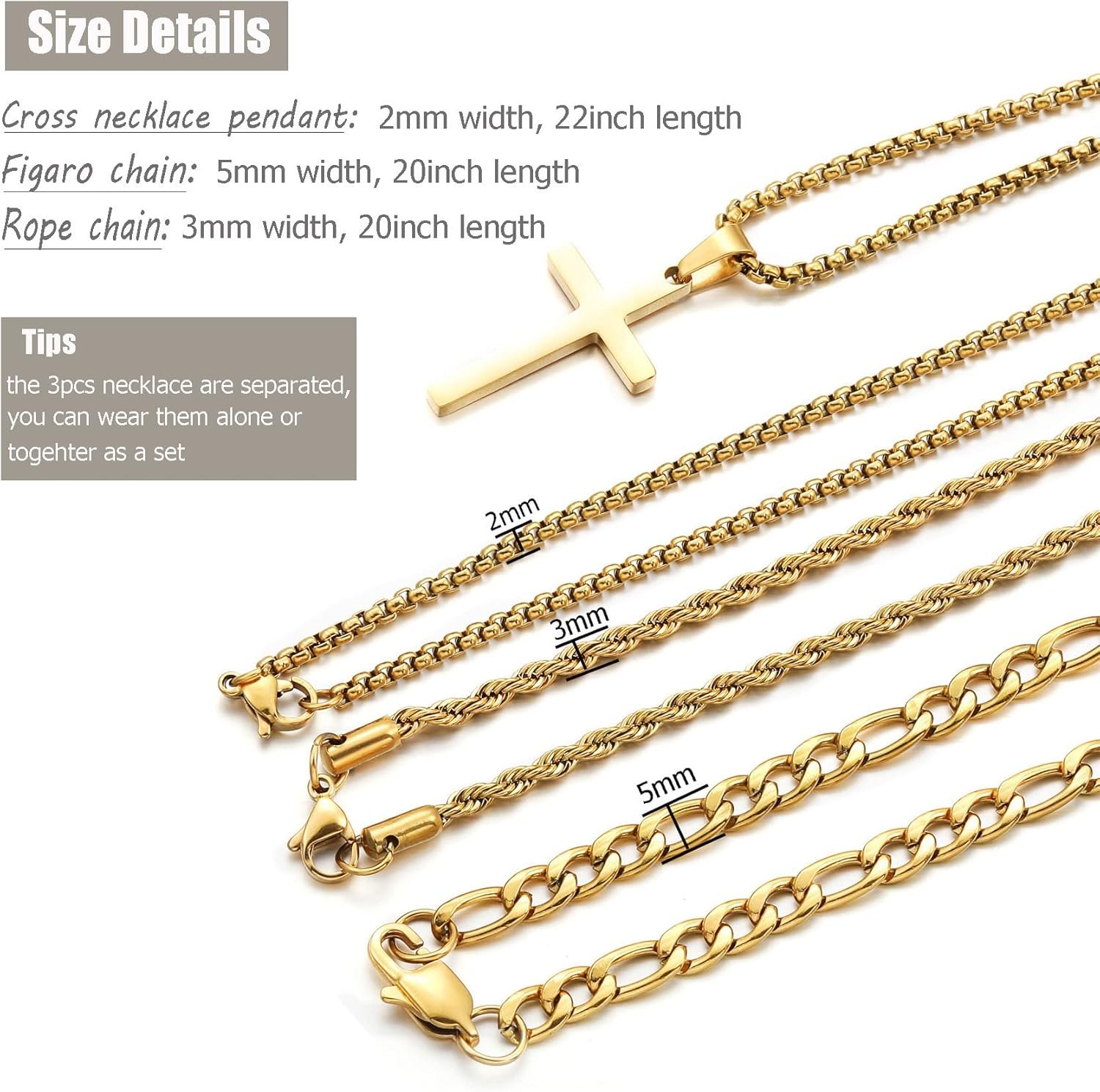 Cross necklace chain: 2mm width, 22 inches longRope Chain: 3mm width, 20 inches longFigaro chain: 4.5mm width, 20 inches long