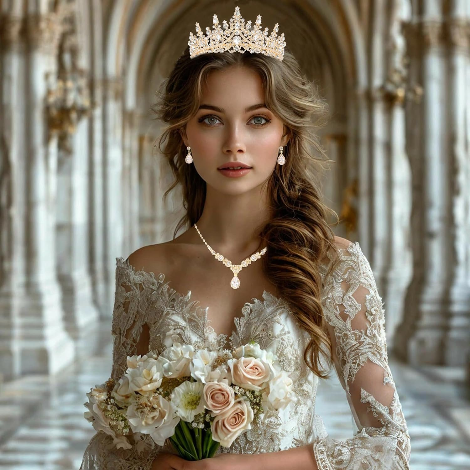 Perfect Fit for Every Queen: This crown for women is thoughtfully designed for a secure and comfortable fit: Tiara: Adjustable steel ring (approx. 6 inch diameter) fits most head sizes. Use the included bobby pins or a ribbon for all-day wear, making it a perfect bridal hair accessory. Necklace: The elegant crystal necklace has an adjustable chain (18 inch). Earrings: Lightweight pierced earrings (1.1 inch) complete the women’s jewelry set.