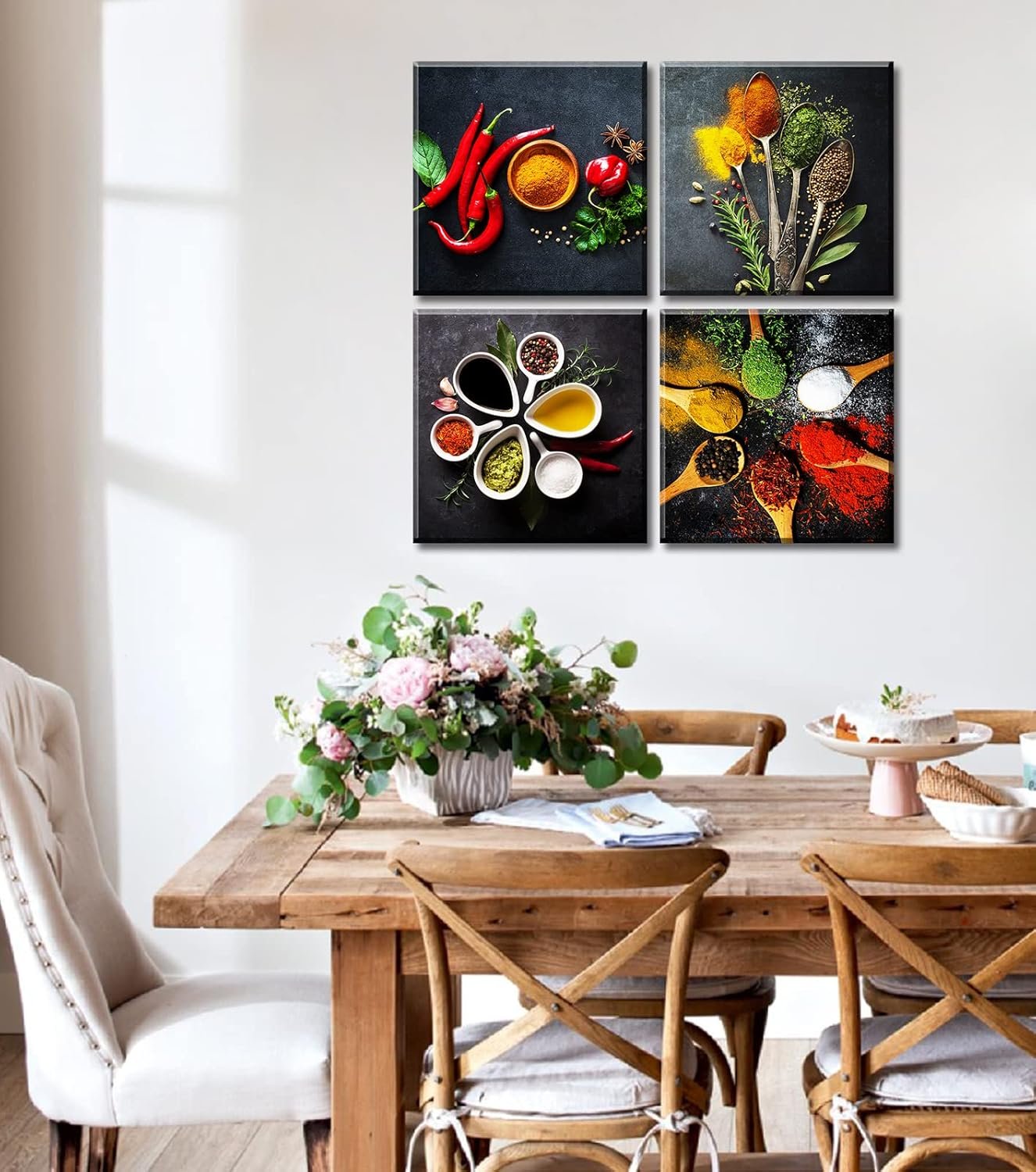 Dining room wall decor: dining room decor, dining room decor for wall, kitchen wall decorations, dining room decorations for the wall, pictures for dining room wall, 4 piece canvas wall art. Seasoning picture decorations can be hung in any scene without conflicting with the style of the home: living room, bathroom, dining room, kitchen, dormitory, bedroom, restaurant, office, conference room, corridor, apartment, hotel, commercial space, etc.