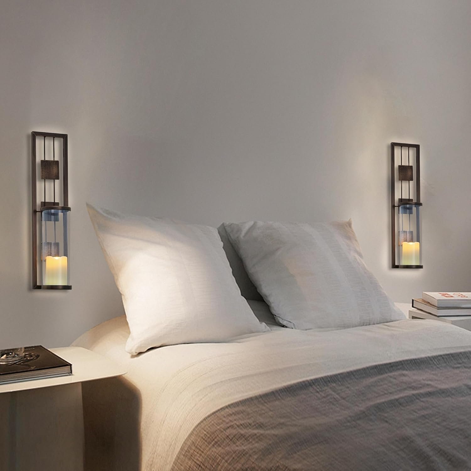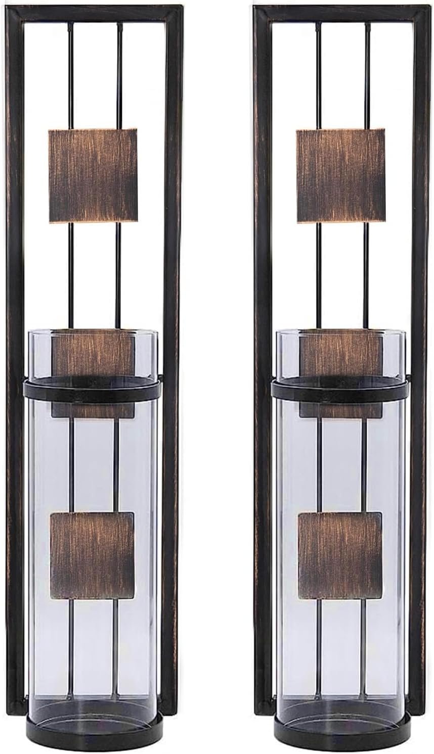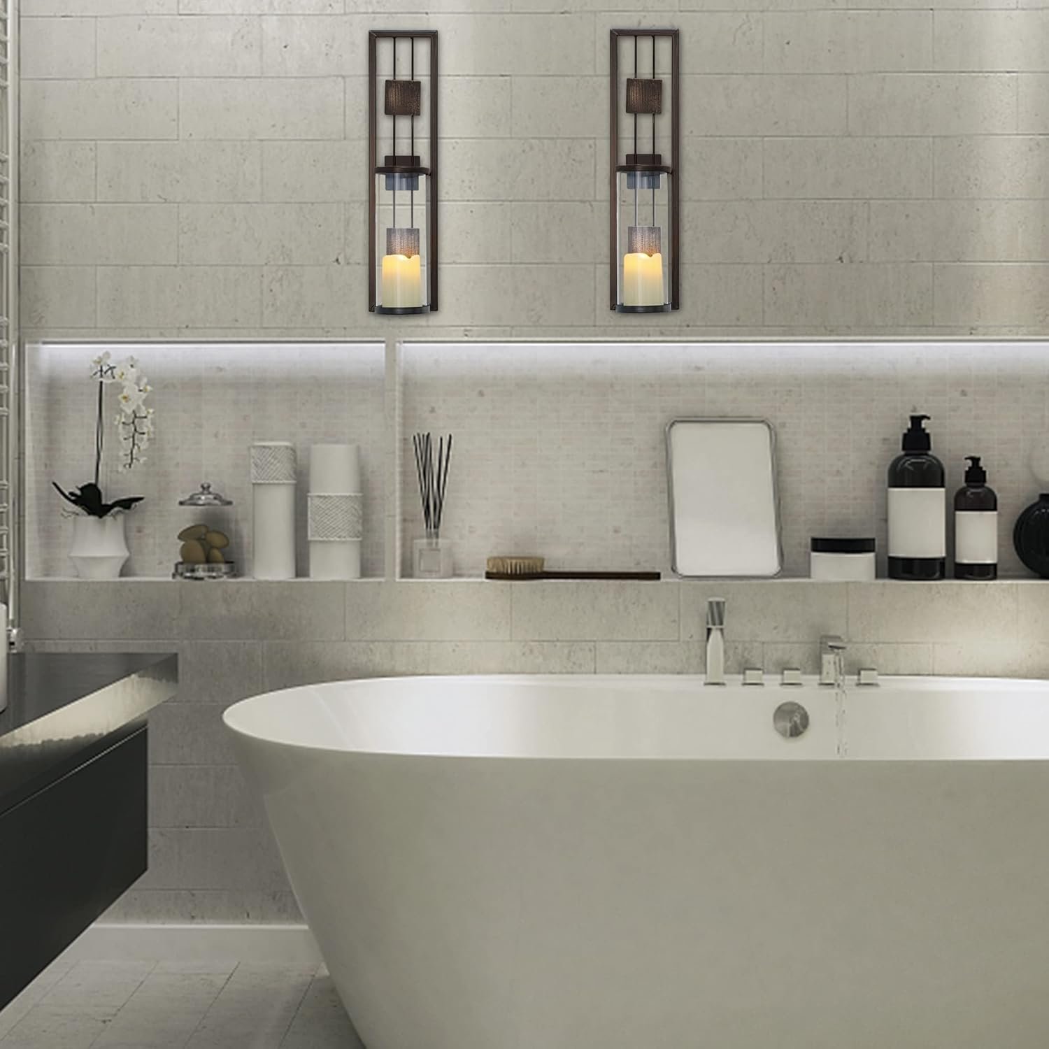 Add an eye-catching look to any space with this fabulous pair of wall sconce candle holders. Each sconce features an openwork rectangular silhouette, cylindrical plastic shade,and flame-less LED light candles to increase brightness.