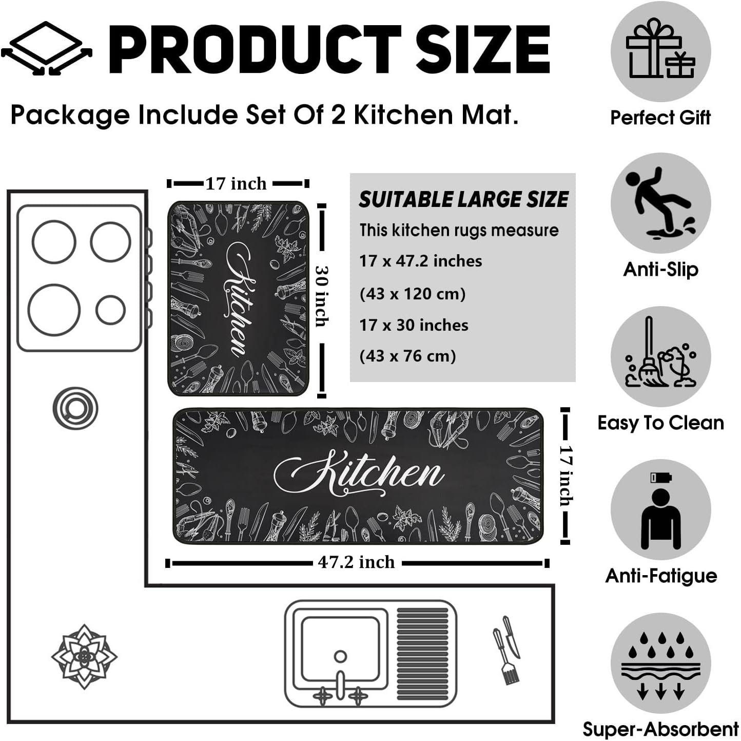 Perfect Size & Durale Material: Measures 17″ x 30″ and 17″ x 47″. One long and one short making them just the right size for the kitchen. Our stylish kitchen mats make a beautiful addition to your kitchen, dining room, craft rooms and office spaces