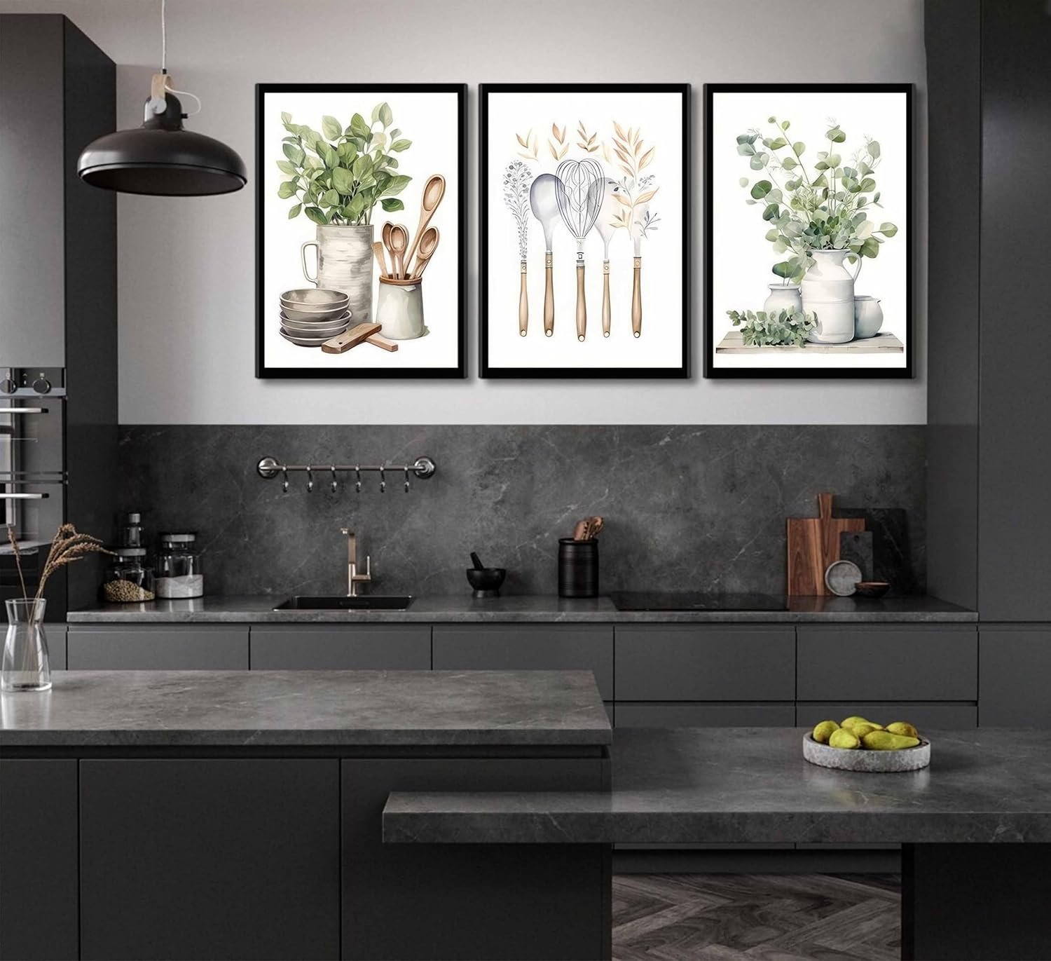 Sage Green Kitchen Wall Art: Each Piece Of art Features Aunique Image of a eucalyptus leaves Sage Wall Decor, and individuality. The use of Vibrant Colors, simple pattern and modern design, Making Them Perfect For Any Contemporary Aesthetic ,adds a touch of creativity and joy to your kitchen environment
