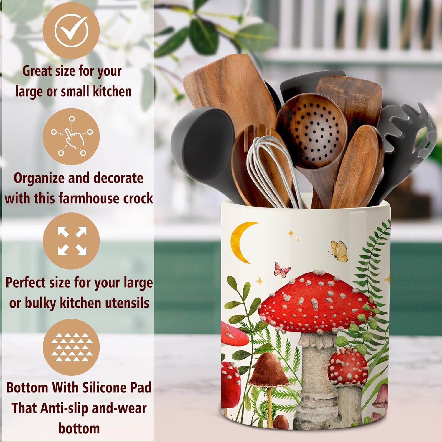 Ceramic Utensil Holder with Non-Slip Mat Kitchen Decor of Rooster, Mushroom, Sunflower, Sunshine, Gnome, Rustic and Farmhouse Style.