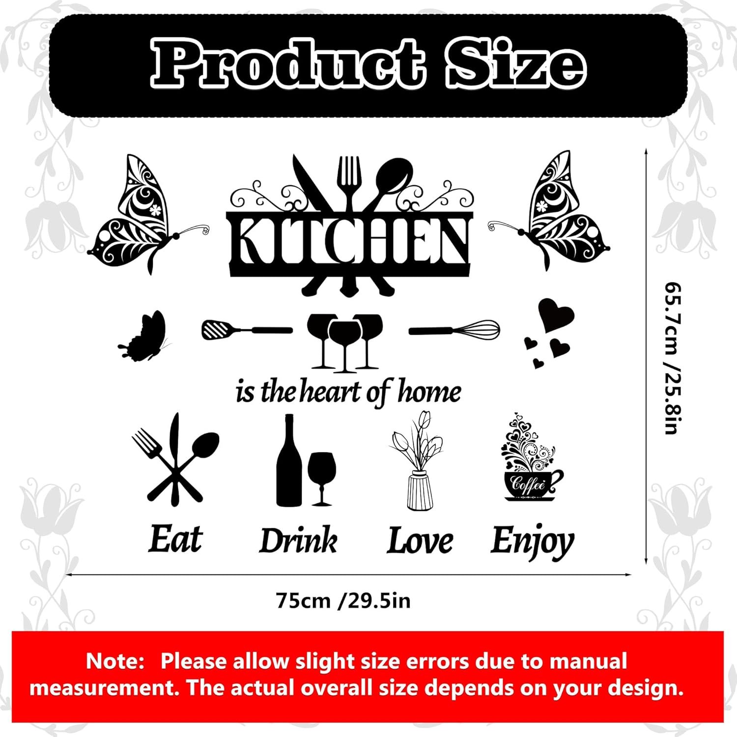 Various Patterns,Warm Quotes:You will get 3 sheets of our kitchen wall stickers,sheet approx size is 11×14.7Inch.Designed with The Kitchen is the Heart of the Home positive phrases,large hollow butterfly, vase, wine glass, knife and fork, coffee, love heart and more.Enough quantity and various sizes for you to arrange freely and DIY a warm kitchen vibe