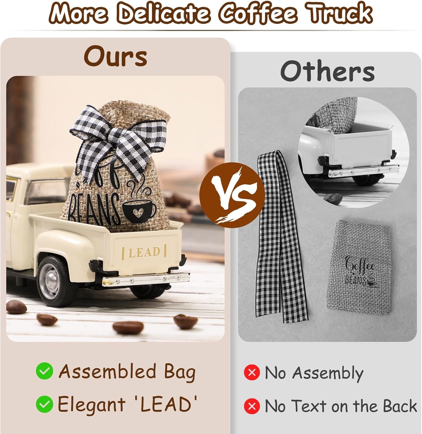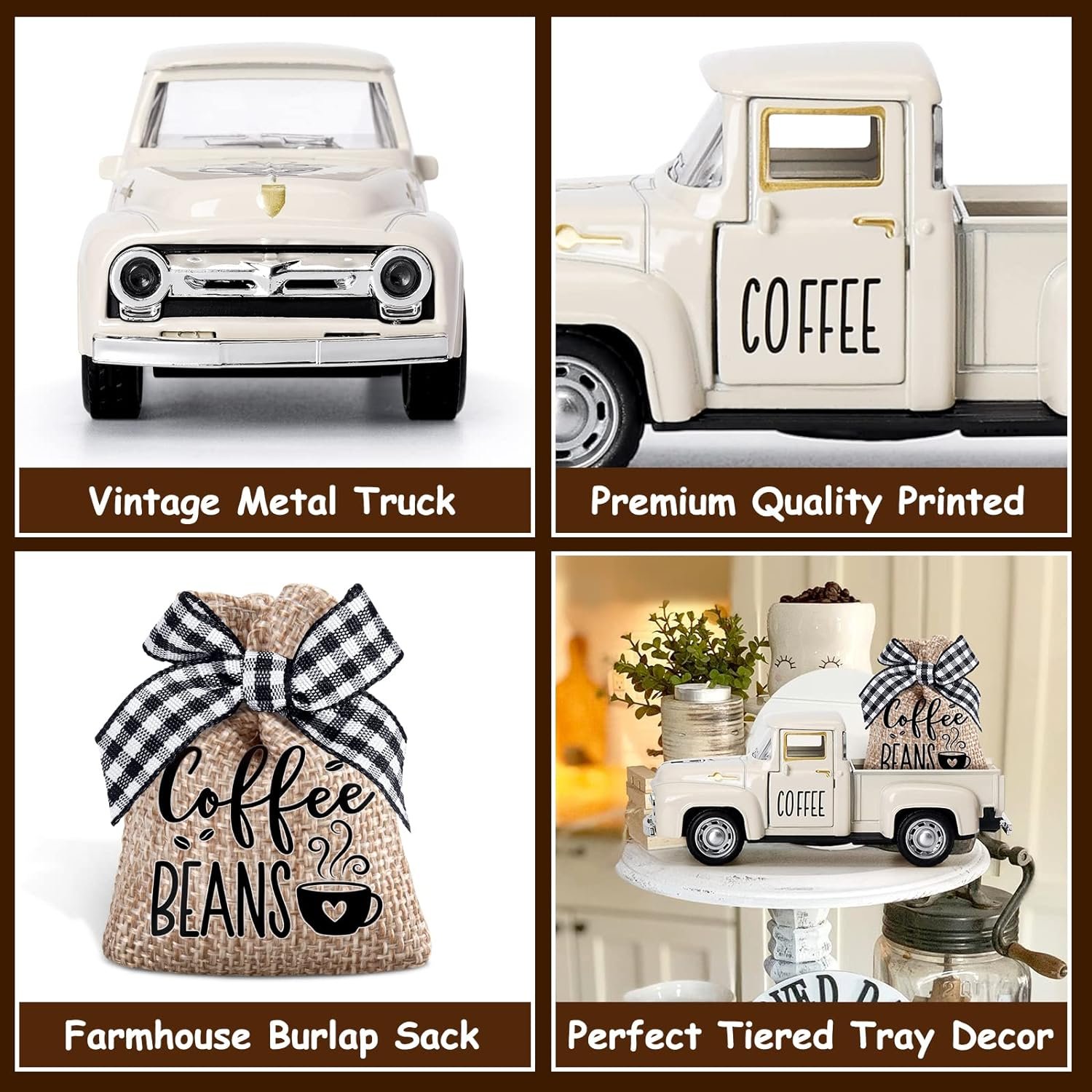GREAT TIERED TRAY DECOR – This adorable mini white truck with a coffee beans mini burlap sack will be a great addition to your farmhouse decor in your tiered tray, mantle, table, shelf, or anywhere around your home. This mini coffee farm truck gives your coffee bar decor a touch of farmhouse style and will be a perfect farmhouse decorative piece for your sweet home.