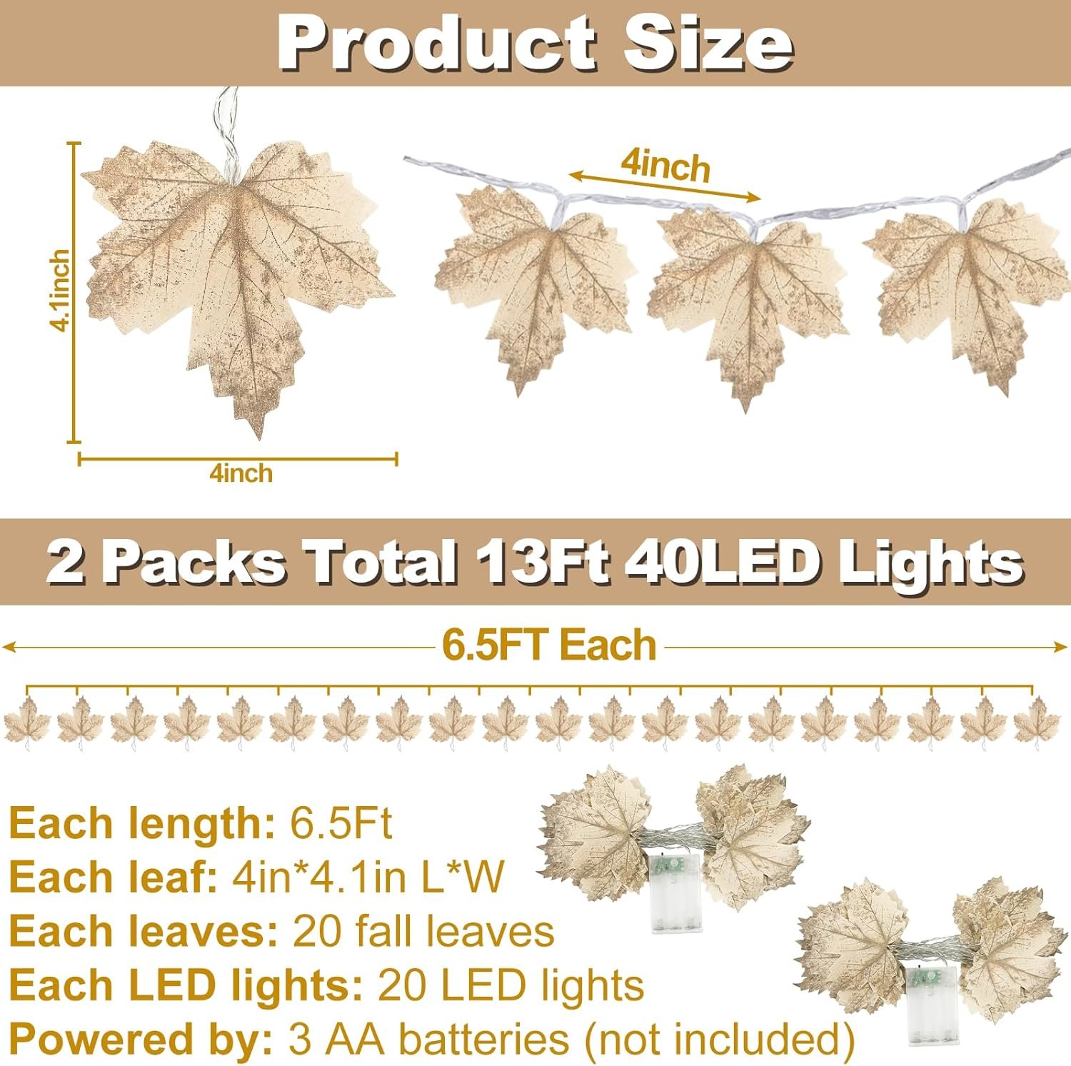 Enlarged Maples Leaves String Lights: The package includes 2 sets of fall maples leaves string lights, total 13 feet/40 LED lights and 40 grey-white maples leaves, with each 6.5 feet/20 LED lights, The maples leaves are specially enlarged to 4 inch