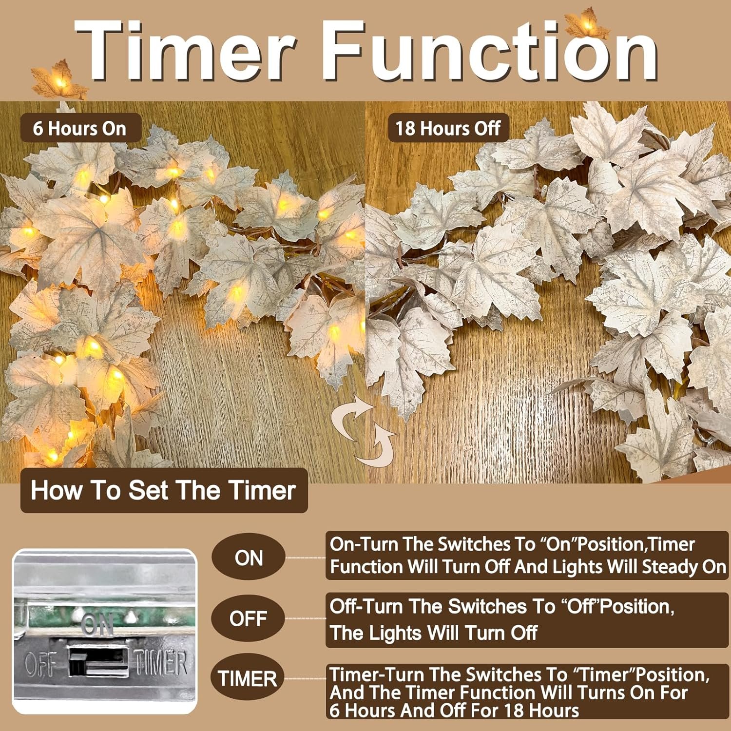 Timer Function: These lighted fall garland come with a timer function that automatically turns on for 6 hours and off for 18 hours every 24 hours. There’s an “On/Timer/Off” button on the battery box for ease of use