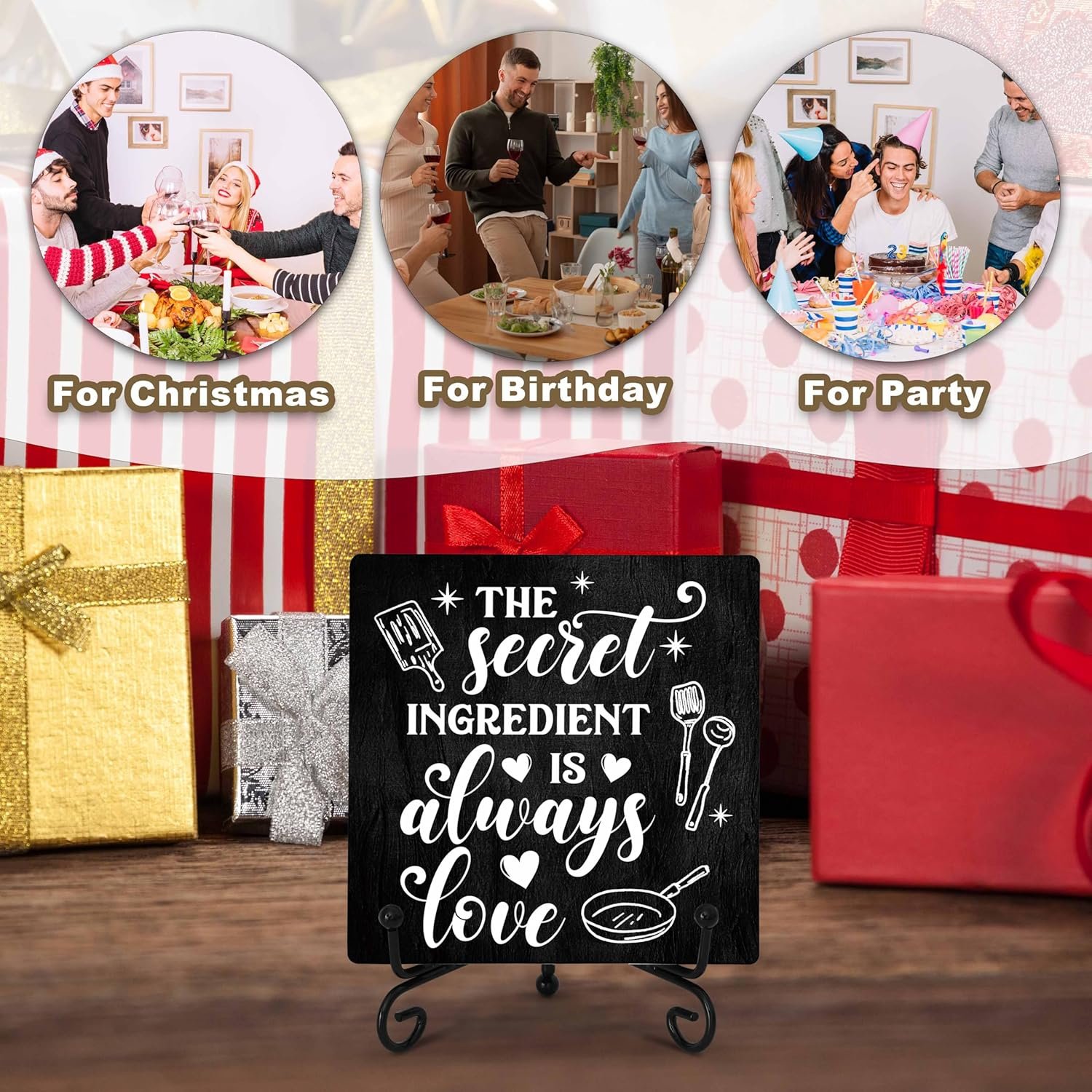 What you will receive: Each set includes a 5.12×5.12 inches wooden plaque and a 5 inches iron stand, suitable for table decorations in the dining room and can be placed anywhere in your home, on a bookshelf or wherever you desire, adding an elegant and beautiful touch.