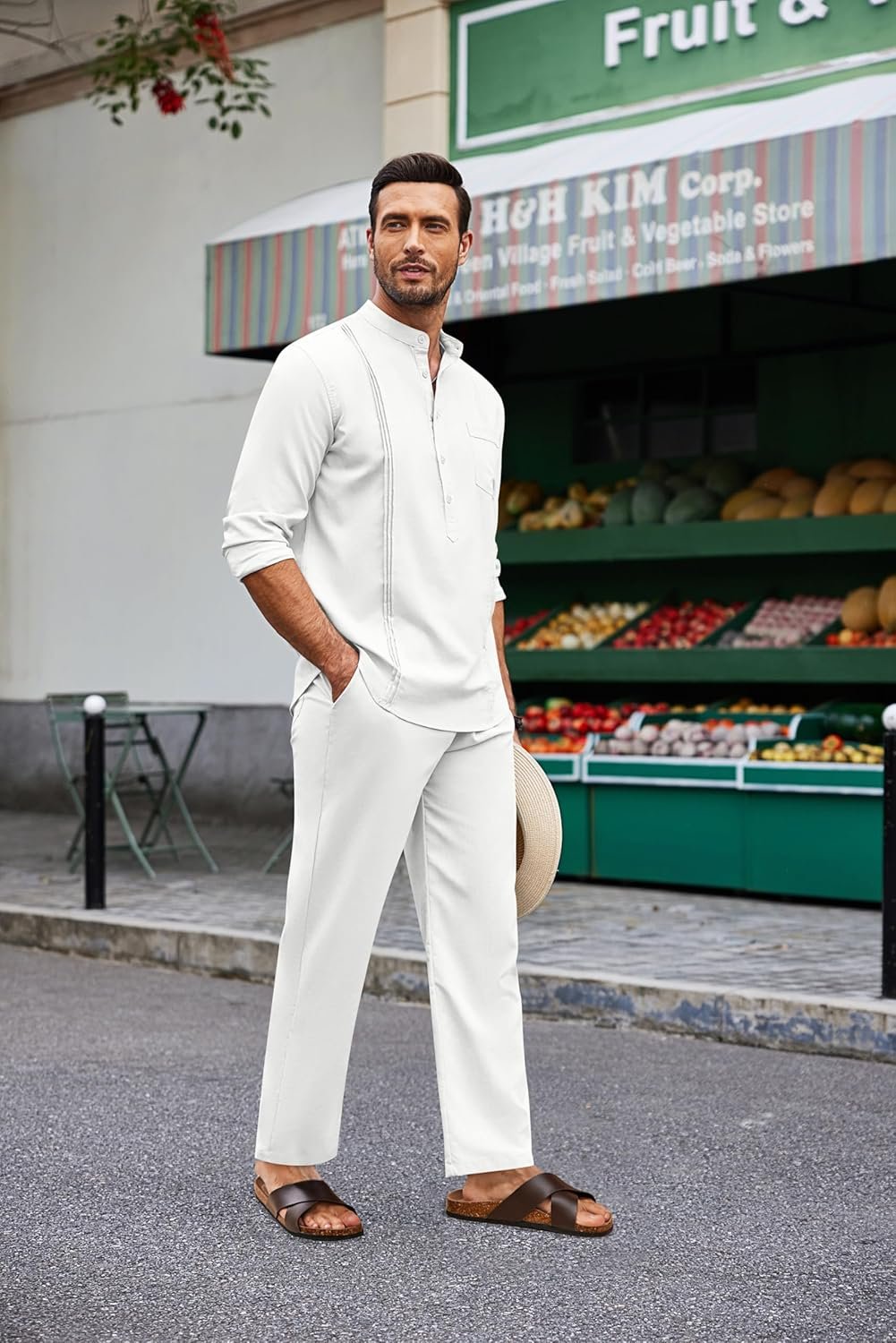 Men’s 2 Piece Henley Shirt and Pant Sets Casual Beach Yoga Outfits COOFANDY Mens Linen 2 Piece Outfits Summer Beach WearCOOFANDY Mens Linen 2 Piece Outfits Summer Beach Wear